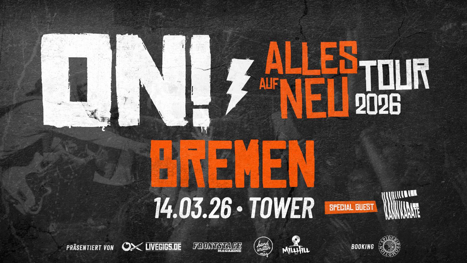 Endlich ist es soweit. Neuer Name. Neue Sprache. Neue Songs. Neue Tour. ON! (aka Tequila & The Sunrise Gang) kommen endlich wieder auf Club-Tour und haben dabei eine Menge neuer Songs im Gepäck - aber die alten Klassiker sind natürlich auch mit dabei. Klingt doch nach einem schweißtreibenden Abend mit bester Stimmung, oder?