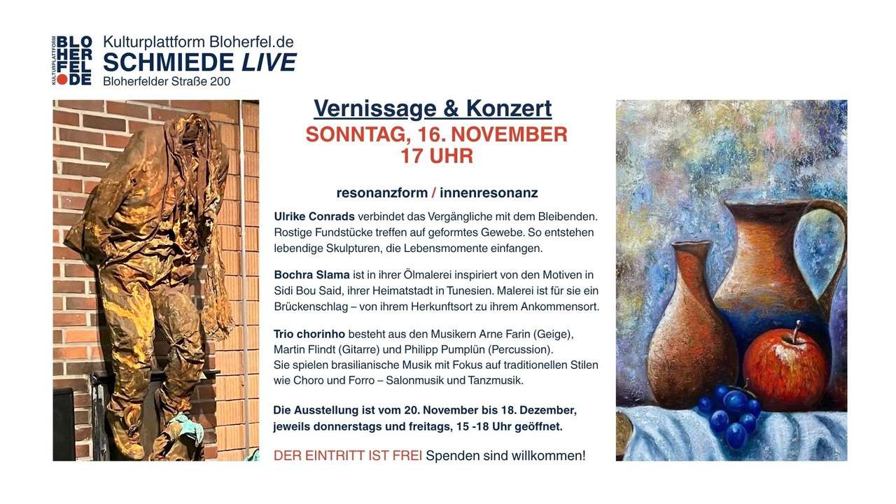 Die SCHMIEDE ist der neue Kunst- und Kulturort fürs urbane Dorf, direkt an der Bloherfelder Straße (Nr. 200). Neben regelmäßigen Ausstellungen und kostenfreien Mitmachangeboten (Do + Fr, 15-18 Uhr) öffnen wir einmal im Monat die Türen zur SCHMIEDE live.